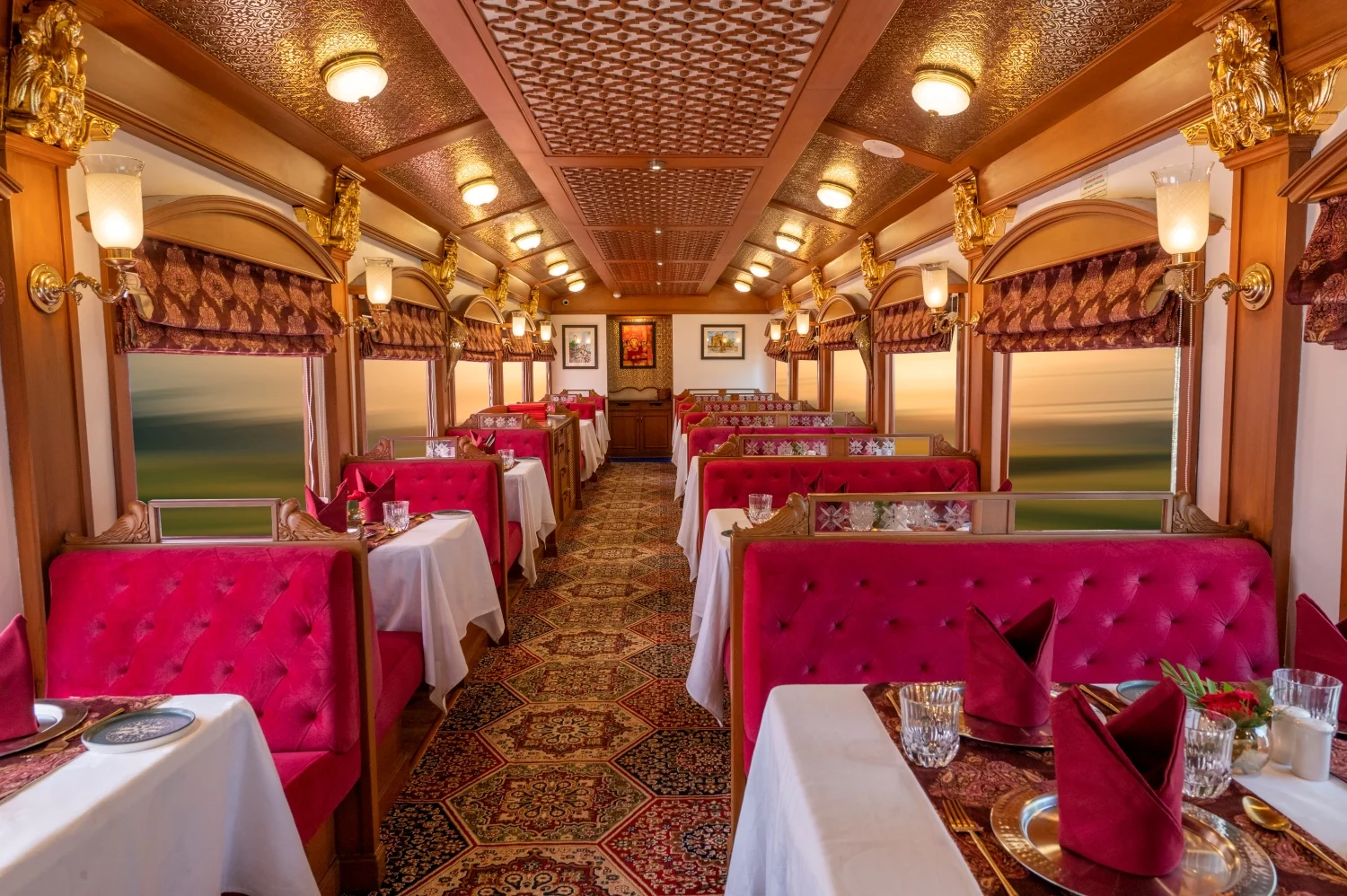 The images capture the richness of the train’s environment, with its exquisite decor and sophisticated ambiance. The attention to detail in the design, from plush furnishings to elegant lighting, is evident in every shot, highlighting the grandeur that defines the Deccan Odyssey experience.